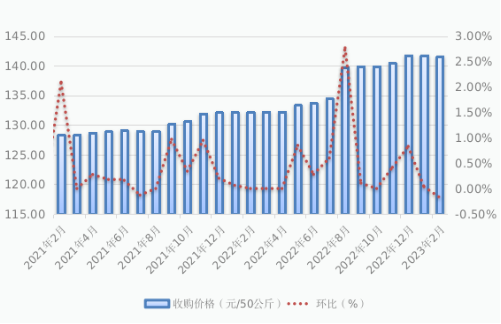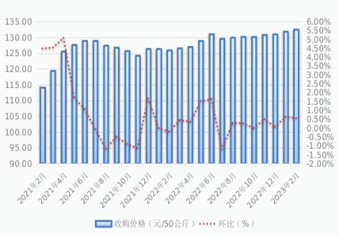 2.玉米价格小幅上涨。2月份全区玉米标准品平均收购价格为132.61元/50公斤,比上月价格略涨0.56%,比去年同期价格上涨5.18%。其中,2月份通辽市玉米标准品收购价格为138.21元/50公斤,比上月价格略涨0.60%,比去年同期价格上涨8.84%。