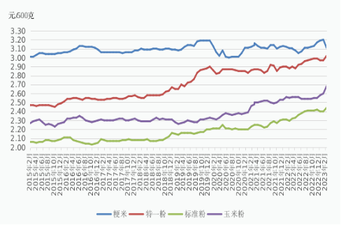 图4:2015年至2023年2月全区主要成品粮零售价格走势图
