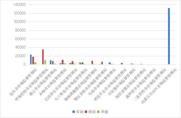 全年接收总量排在前三位的是包头市市场监督管理局、呼和浩特市市场监督管理局、通辽市市场监督管理局。各项数据中,投诉接收量、举报接收量排前三位的均为呼和浩特市市场监督管理局、包头市市场监督管理局、赤峰市市场监督管理局。