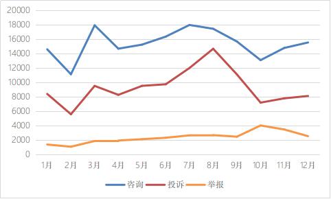 从全年各月受理量走势看,2月份正值春节期间,全区各级市场监督管理部门加大执法力度,严格规范市场秩序,消费环境日趋平稳和健康,各项数据较小;3月份受“3·15”活动的影响,消费者希望在3·15期间维护自身消费权益、解决消费纠纷,各项数据大幅增长;4月份以后数据总体趋于平稳。7、8月份正值暑假期间,外出活动消费增长、学生大多参加培训班,导致投诉相对较多。