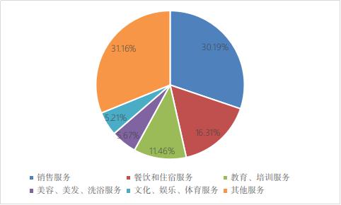 服务类举报中,销售服务类以5403件居首位,占服务类举报的36.20%,同比增长532.67%。举报主要涉及零售服务、互联网直销服务、预付卡服务、优惠卡销售服务等,主要涉及广告、价格、质量等问题。其他举报较多的服务主要涉及餐馆服务、美容美发服务、技能培训服务、物业服务、洗浴按摩服务等,主要问题是虚假广告宣传、服务质量差和欺诈消费者。